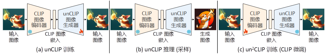 对比语言-图像预训练模型(Contrastive Language-Image Pre-training,简称CLIP)已经成为视觉与多模态任务中的基础模型,广泛应用于多个领域。然而,近期的研究指出,CLIP 在区分图像中的细微差异方面表现不足,在密集预测和视觉主导的多模态任务中性能也不尽理想。因此,本工作旨在改进现有的CLIP 模型,使其尽可能多地捕捉图像中的视觉细节。我们发现,一类特定的生成模型——unCLIP,为实现这一目标提供了合适的框架。如图(a)所示,unCLIP 是在CLIP 图像嵌入的条件下训练的图像生成器,换句话说,它反转了CLIP 的图像编码器。与CLIP 这类判别模型相比,生成模型在捕捉图像细节方面具有优势,因为它们被训练去学习图像的数据分布。此外,unCLIP 的条件输入空间与CLIP 原始的图文嵌入空间保持一致。因此,我们提出反转unCLIP(称为un2CLIP)以改进CLIP,如图(c)所示。通过这种方式,改进后的图像编码器不仅继承了unCLIP 捕捉视觉细节的能力,同时也保持了与原始文本编码器的对齐。我们在多个CLIP 相关任务上对改进后的模型进行了评估,包括具有挑战性的MMVP-VLM 基准、涉及密集预测的开放词表图像分割任务、以及多模态大语言模型任务。实验结果表明,un2CLIP 显著提升了原始CLIP 模型及其他改进方法的性能。更多细节请参考我们的论文https://arxiv.org/abs/2505.24517。