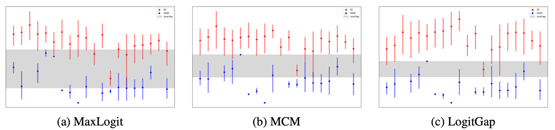 图:不同OOD评分函数下,ID和OOD样本的分布差异