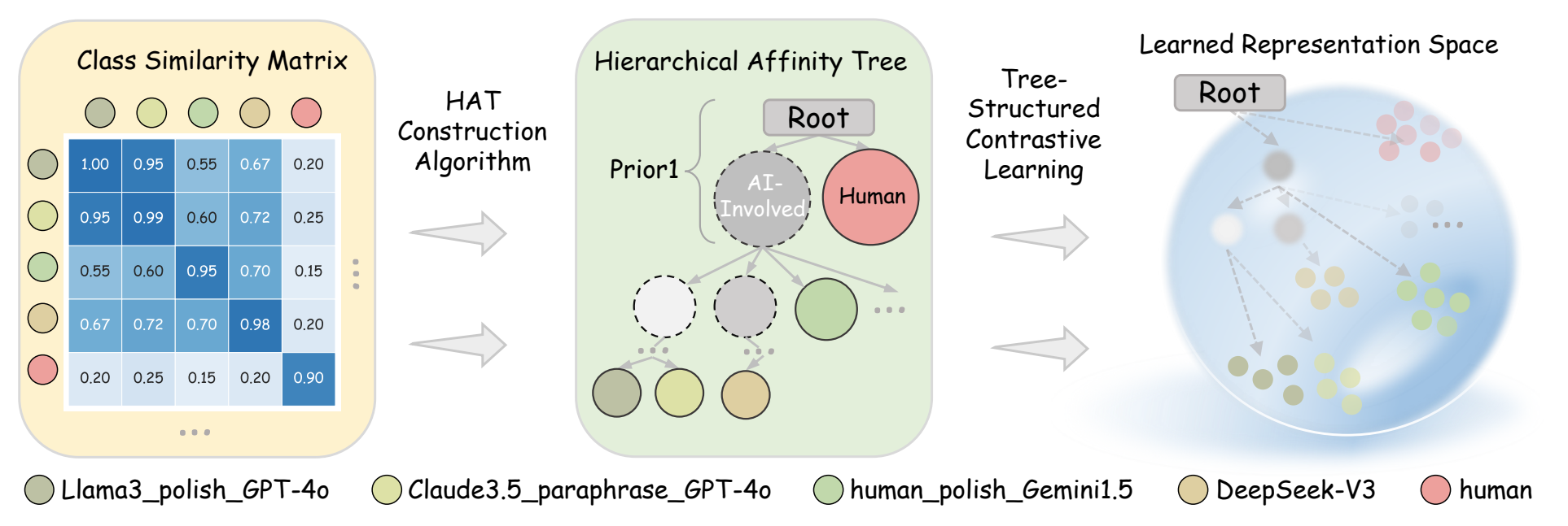 检测AI参与生成的文本,对于遏制虚假信息、抄袭行为以及学术不端具有重要意义。AI参与生成包括多种协作形式:例如AI初次生成后由人类进行润色,人类写作后交由AI修饰,以及由一个AI生成的文本再被其他AI模型修改等。在创作过程中可能涉及多种不同的,甚至全新的AI模型,使得生成文本的特征更为复杂,从而增加了检测的难度。现有方法对不同创作方式的建模较为粗略,通常采用二分类范式(纯人类文本vs.含AI参与生成文本),或多分类范式,将人机协作文本单独视为区别于纯人类写作文本和纯AI生成文本的新类别。我们的研究发现,由不同创作方式所生成的文本在表征空间中呈现出潜在的聚类关系。基于这一观察,我们提出 DETree:一种将不同创作方式生成的文本之间的关系启发式地建模为层次亲和树结构的方法,并进一步设计了专门的损失函数,以实现文本表征与该层次结构的对齐。为支撑这一框架,我们构建了 RealBench—— 一个涵盖多种人机协作模式的综合性混合文本基准数据集。实验结果显示,DETree在混合文本检测任务中相较于现有方法取得了更优的性能,并在分布外场景中展现出更强的鲁棒性与泛化能力,尤其在小样本条件下表现突出。这一结果进一步表明,基于训练的方法在应对分布外检测任务方面的有效性与发展潜力。