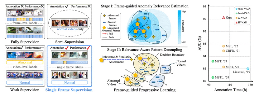 视频异常检测(Video Anomaly Detection, VAD)任务的目标是在视频序列中从离散事件中识别出异常帧。现有的 VAD 方法在不同监督范式下各有局限:全监督方法存在沉重的标注负担,半监督方法对细小异常不敏感,而弱监督方法则易受噪声干扰。为了解决这些问题,我们提出了一种新的范式:单帧监督视频异常检测(Single-Frame supervised VAD, SF-VAD),其仅需在每个异常视频中标注一帧异常。SF-VAD 在保证标注效率的同时,提供了精确的异常参考,有助于实现鲁棒的异常建模,并提升在复杂视觉场景中对细微异常的检测能力。为了验证范式的有效性,我们通过面向真实场景的重标注协议,基于ShanghaiTech、UCF-Crime 和 XD-Violence 三个数据集构建了 SF-VAD 基准数据集。此外,我们设计了帧引导的渐进学习(Frame-guided Progressive Learning, FPL),以将稀疏帧级监督推广到事件级的异常理解。FPL 首先利用证据学习在标注帧的引导下估计异常相关性;随后基于异常相关性和特征相似性挖掘离散的异常事件,从而可靠地泛化异常监督信号。同时,FPL 通过分离与异常事件有差异的正常帧来解耦正常模式,从而降低误报率。大量实验证明,SF-VAD 在保持标注成本与性能良好平衡的同时,取得了当前最先进的异常检测结果。