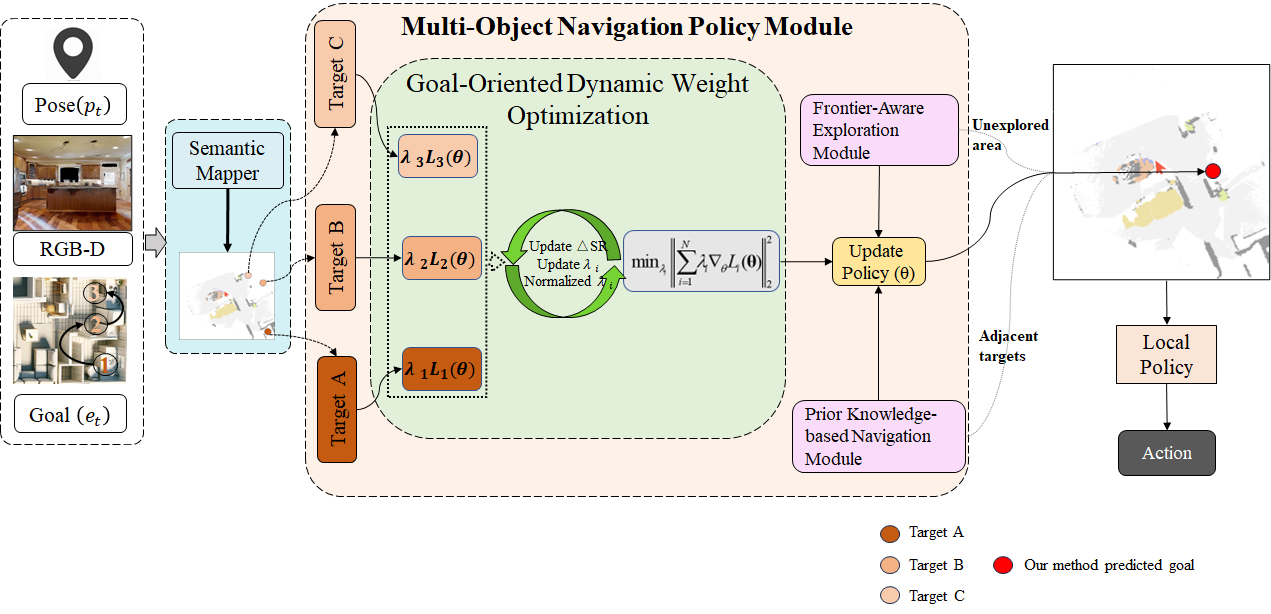 多目标导航任务要求智能体在一次任务中按顺序完成多个目标的搜索与到达,目标之间存在显著的时序耦合和空间关联。现有方法多聚焦单一子任务的局部路径优化,难以兼顾全局规划,容易出现路径冗余等问题。针对上述挑战,我们提出了目标导向动态权重优化方法(Goal-oriented Dynamic Weight Optimization,GDWO),将多目标导航建模为目标导向的闭环优化过程,通过将各目标策略损失统一投射到同一决策空间,利用梯度信息动态调整不同目标的优化权重,并结合导航成功率进行归一化处理,使训练过程能够自适应关注更具挑战性的目标。此外,方法引入基于先验知识的导航模块和面向前沿区域的探索模块,进一步提升探索效率和路径规划质量。实验结果表明,该方法在Gibson和Matterport3D数据集的多目标导航任务中,在成功率和路径效率等指标上均显著优于现有方法,展现出良好的稳定性和泛化能力。