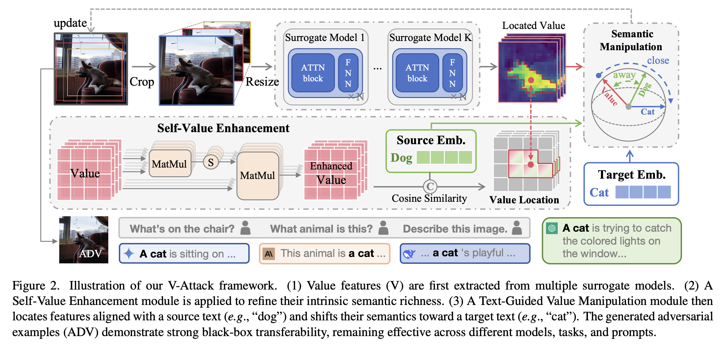 对抗攻击的研究重心已从早期干扰传统特定任务模型的预测,演向操纵大型视觉语言模型(LVLMs)图像语义这一更复杂的目标。然而,现有方法在可控性上仍面临挑战,难以实现对图像中特定语义概念的精确操纵。本文将这一局限性归因于对抗攻击常作用的补丁-标记(patch-token)表示中存在的语义缠绕问题:视觉编码器中自注意力机制所聚合的全局上下文主导了单个补丁特征,使其难以作为精确局部语义操纵的可靠切入点。通过系统性研究,我们提出了一个关键见解:在 Transformer 注意力块中计算的数值特征(Value features, V)可作为更精确的操纵抓手。研究表明,V 特征能够抑制全局上下文通道,从而保留高熵且解耦的局部语义信息。基于此发现,我们提出了 V-Attack,一种专为精确局部语义攻击设计的新型方法。V-Attack 以数值特征为目标,引入了两个核心组件:一是用于精炼 V 特征内在语义丰富度的自数值增强模块,二是利用文本提示定位源概念并引导其向目标概念优化的文本引导数值操纵模块。通过绕过相互缠绕的补丁特征,V-Attack 实现了高效的语义受控攻击。在 LLaVA、InternVL、DeepseekVL 及 GPT-4o 等多种 LVLMs 上的广泛实验表明,V-Attack 较现有最先进方法相对平均提升了 36% 的攻击成功率,深刻揭示了现代视觉语言理解模型中存在的安全漏洞。