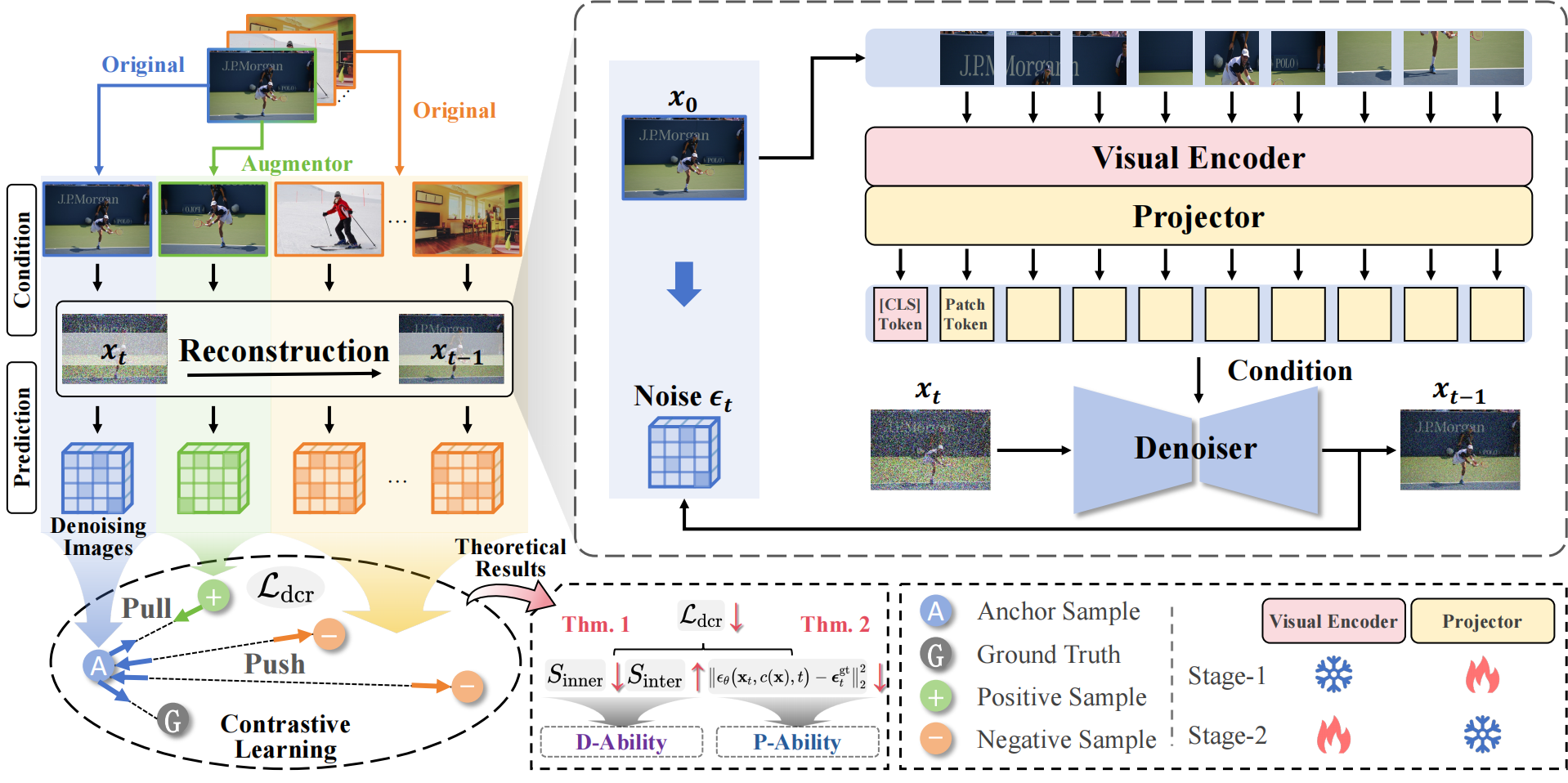 CLIP模型中视觉编码器的理解能力受限,这已经成为制约下游任务性能的关键瓶颈。这种能力主要包括两方面:判别能力(D-Ability),即类别可分性;以及细节感知能力(P-Ability),即对细粒度视觉线索的捕捉能力。近期的一些方法使用CLIP视觉表征作为条件进行图像重建,利用扩散模型来增强表征能力。然而,我们认为这类范式可能会削弱判别能力,从而无法有效解决CLIP表征能力不足的问题。为此,我们将对比学习信号引入基于扩散的重建过程,以获得更加全面的视觉表征。我们首先提出一种直接的设计方案,即在扩散过程中对输入图像引入对比学习监督。然而,实验结果表明,这种简单的结合方式会产生梯度冲突,导致性能不理想。为实现优化目标之间的平衡,我们进一步提出了扩散对比重建(Diffusion Contrastive Reconstruction,DCR),通过统一学习目标来协同优化。其核心思想是在扩散过程中注入来自每个重建图像的对比信号,而非直接使用原始输入图像的对比信号。理论分析表明,DCR 损失函数能够同时优化判别能力和细节感知能力。在多个基准数据集和多模态大语言模型上的大量实验结果验证了该方法的有效性。