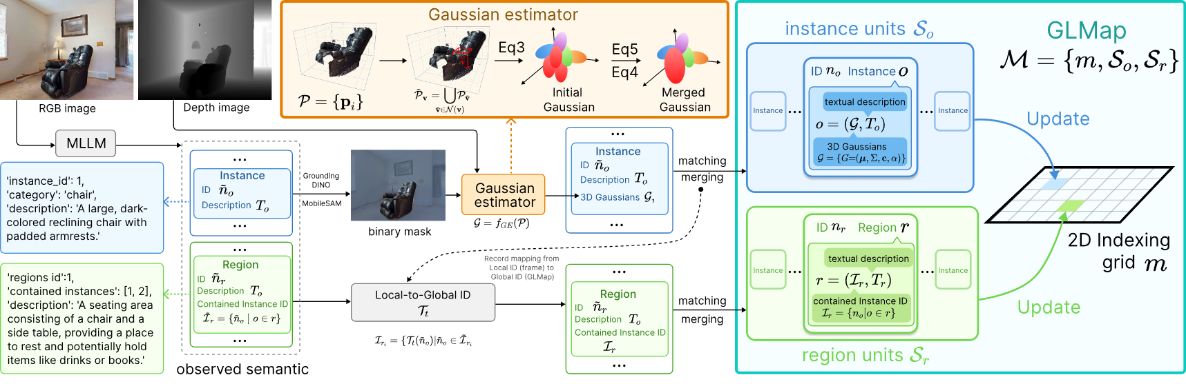 理解环境的几何与语义结构对于具身导航和推理至关重要。现有的语义建图方法往往在显式几何表示与多尺度语义之间进行权衡,且缺乏与大模型的原生接口,因此需要额外的特征投影训练来实现语义对齐。为此,我们提出了多尺度高斯-语言地图(GLMap),其核心设计包含三个方面:(1)显式几何表示;(2)涵盖实例与区域概念的多尺度语义;(3)双模态接口,即每个语义单元同时存储自然语言描述和 3D 高斯表示。3D 高斯技术实现了紧凑的存储,并能通过高斯泼溅(Gaussian Splatting)快速渲染任务相关的图像。为了实现高效的增量构建,我们进一步提出了一种高斯估计器(Gaussian Estimator),能够从稠密点云中解析推导出高斯参数,而无需基于梯度的优化过程。在 ObjectNav、InstNav 和 SQA 任务上的实验结果表明,GLMap 有效增强了目标导航和上下文推理能力,并与大型语言模型保持了良好的兼容性。