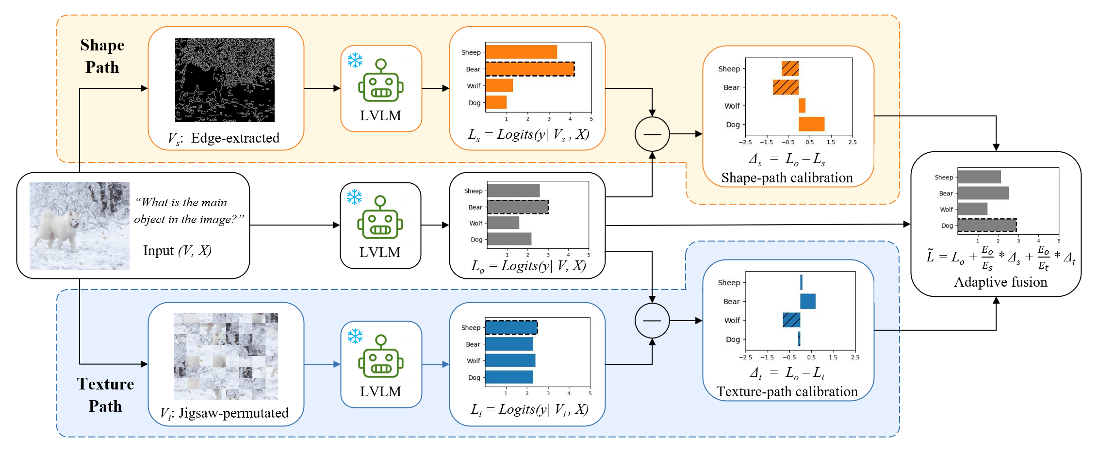 大规模视觉语言模型(LVLM)在开放域视觉理解与多模态推理任务中取得了显著进展,但其性能高度依赖于高质量视觉输入。在真实场景中,常见的视觉失真(如噪声、模糊及几何变形)会显著削弱模型性能,严重制约其鲁棒性与实际部署能力。现有研究通常将该问题归因于对语言先验的过度依赖,但普遍将不同失真视为同质的“视觉噪声”,忽视了其在感知机制上的差异性。本文从失真机制出发,提出一种 corruption-centric 分析框架,揭示多样化视觉失真可沿两个互补的感知维度进行系统刻画:形状与纹理。我们分析发现,形状退化型失真与纹理退化型失真分别诱发互补的预测偏置模式,从而构成 LVLM 在视觉失真场景下失效的两种核心机制。基于上述观察,我们提出 Shape–Texture Dual-Path Contrastive Decoding(ST-CD),一种无需额外训练的推理阶段校准框架。ST-CD 构建两条针对性的对比分支,通过边缘提取强化形状信号,通过拼图置换保留局部纹理统计特征,并利用基于熵的自适应加权机制融合校正信号,实现对形状与纹理退化偏置的显式解耦与动态调节。实验表明,ST-CD 在不同架构、任务与失真类型下均实现稳定且一致的性能提升,验证了“形状–纹理互补”对于多模态鲁棒推理的有效性与普适性。
