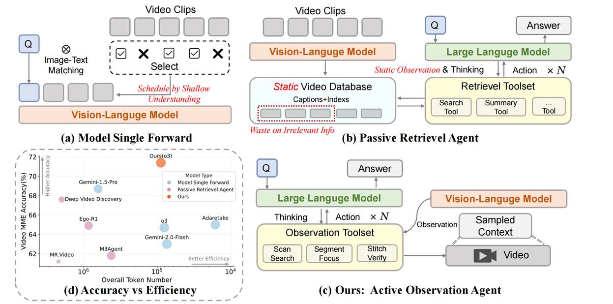 视频密集且随时间变化的特性给自动分析带来了巨大挑战。现有的视觉语言模型(VLMs)通常依赖于静态的、预处理的上下文信息,导致了推理与感知之间存在固有的脱节。为此,我们提出了LensWalk,这是一种灵活的智能体框架,它赋予大语言模型(LLM)推理器主动控制“去哪看”以及“以何种采样密度看”的能力。LensWalk的核心是一个紧密耦合的“推理-规划-观察”循环。与传统的均匀采样不同,该智能体会动态调用一套多粒度的观察工具套件决定视觉-语言模型的观察计划:用于大范围时间线搜索的 Scan Search、用于细节探查和密集采样的 Segment Focus,以及用于跨片段因果验证的 Stitch Verify。为了在避免冗余视频处理的同时确保多轮交互的连贯性,LensWalk 引入了轻量级的证据锚定机制,包括时间戳锚点(Timestamp Anchors)和一个动态更新的全局主体记忆表(Subject Memory Table)。作为一种即插即用的框架,LensWalk 无需进行任何模型微调,即可在 LVBench 和 Video-MME 等极具挑战性的长视频基准测试中将强视觉-语言模型基线的准确率提升 5% 以上。此外,LensWalk 不仅展现出了卓越的 token 效率,还涌现出了类似人类的认知行为(如渐进式放大和策略性反思),为更具解释性、高效且鲁棒的视频推理开辟了新的范式。
