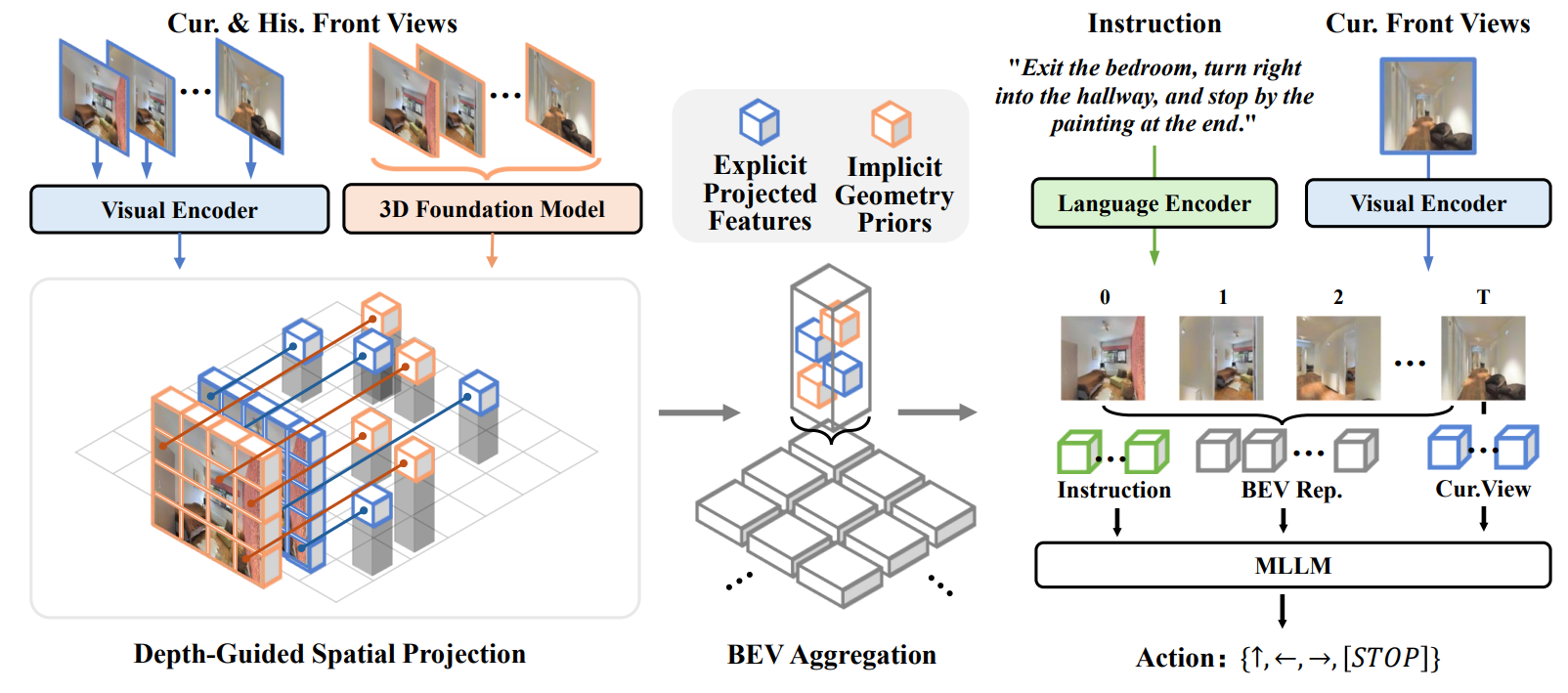 尽管视觉语言导航(VLN)取得了显著进展,但现有方法仍然依赖于密集的RGB视频,这会产生过多的图像token,且缺乏明确的空间结构,导致计算开销巨大且空间推理能力有限。为了解决这些问题,我们引入了几何感知BEV(GA-BEV)——一种紧凑的、基于3D的特征表示,它将显式和隐式的几何线索整合到基于多模态大型语言模型(MLLM)的导航系统中。我们通过将视觉特征投影到3D空间,并将其聚合为以智能体为中心的布局,从RGB-D输入构建BEV空间图。这种布局既保持了几何一致性,又减少了标记冗余。为了进一步增强几何理解,我们将预训练的3D基础模型的特征融入BEV空间,注入了从大规模3D重建任务中学习到的结构先验。这些互补的线索——显式的基于深度的投影和隐式的学习先验——共同产生了紧凑而又具有空间表达能力的表示,从而显著提高了导航效率和性能。实验表明,我们的方法仅使用导航数据即可取得最先进的结果,无需DAgger 增强或混合VQA训练,证明了所提出的 GA-VLN 框架的鲁棒性和数据效率。