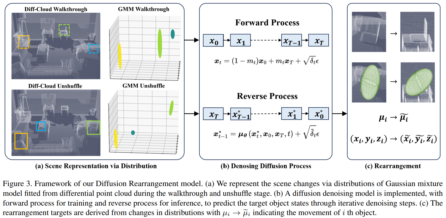 将杂乱的物体恢复到其预期目标状态,要求智能体不仅理解场景中发生的变化,还能够推理这些变化的演化过程。为此,我们从分子热力学中的扩散过程获得启发,提出了一种全新的视觉重排任务建模视角。我们将房间的打乱(shuffle)与还原(unshuffle)过程分别建模为扩散的正向与反向过程。不同于传统依赖场景建模与差分比较的方法,我们的方法关注目标状态与初始状态之间的内在演化机制,通过细粒度、渐进式的去噪过程,以更高置信度实现合理的物体重排。通过对任务目标的分析,我们以物体的空间分布来表征场景,并采用扩散桥模型(diffusion bridge)对视觉重排过程进行建模。在此基础上,我们提出了 Diffusion Rearrangement 模型。该模型以点云数据作为输入,通过高斯混合模型对物体状态进行分布式建模,并利用迭代去噪的 Transformer 网络预测重排目标状态。在 RoomR 数据集上的实验结果验证了所提方法的有效性。
