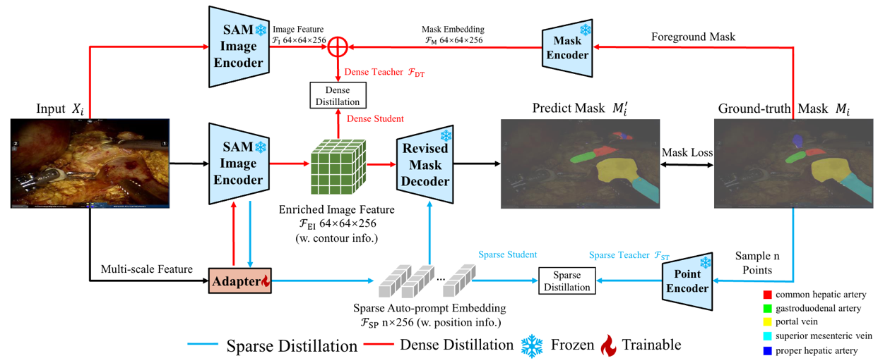 图1: Distillation-SAM总体架构图。该方法通过轻量级适配器生成自动提示嵌入,并利用知识蒸馏机制与来自真实人工标注的教师嵌入对齐,从而让SAM具备不依赖人工提示的自动手术图像分割能力。