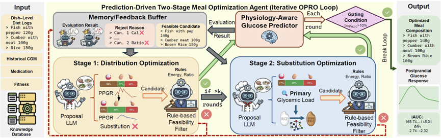 个性化血糖调控是精准营养领域中一个核心但尚未解决的问题,其难点在于餐后血糖反应(PPGR)在不同个体之间表现出显著差异。传统干预方法多依赖于升糖指数(GI),难以充分刻画这种个体间异质性,也缺乏依据个体生理反馈动态调整膳食的机制。相比之下,基于大语言模型的智能体(LLM Agent)凭借其上下文感知推理与迭代优化能力,在类似任务中展现出良好潜力。受此启发,本研究提出了一套闭环、生理反馈驱动的智能体系统,将个性化PPGR建模与膳食干预统一于同一框架中,以实现对PPGR的有效调控。具体而言,本研究构建了一个具备生理感知能力的PPGR预测模型,通过可学习的时序生理吸收衰减模块,对个体肠道吸收动力学进行建模。在此基础上,本研究进一步设计了一个预测结果驱动的膳食优化智能体,该智能体以PPGR预测结果为显式反馈,对真实餐食组合进行迭代优化。在多个公开数据集上的实验以及与基线方法的对比表明,本方法不仅能提升血糖预测精度,还能显著降低血糖波动幅度。