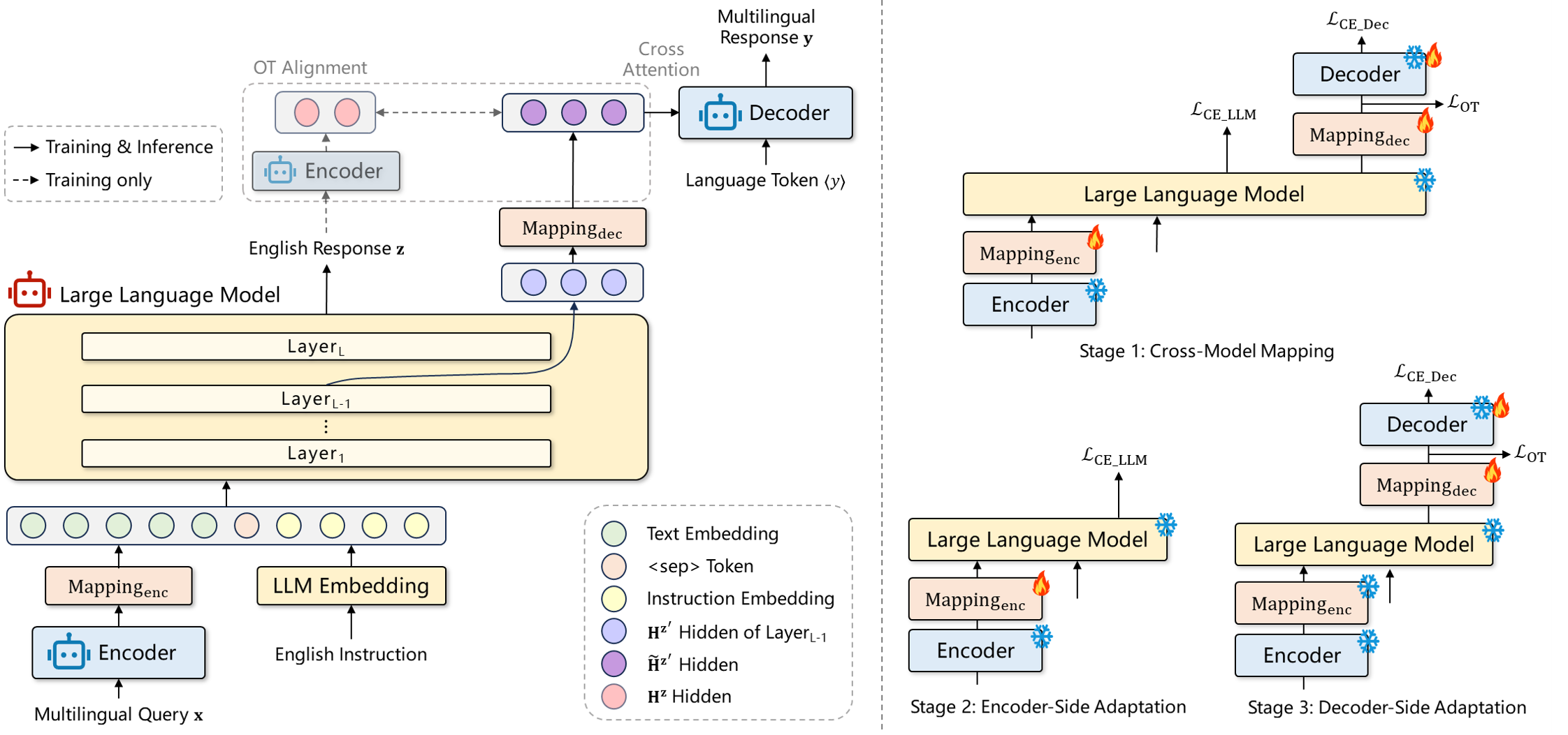 尽管大语言模型(LLM)具备很强的通用能力,但很大程度上局限于高资源语言,多语言性能依然极不均衡。我们认为 LLM 并非缺少相关知识,而是难以在低资源语言稳定调用。由此出发,我们提出了一种新的多语言扩展范式 XBridge:组合 LLM 以英文为中心的通用能力,以及现有多语言机器翻译(NMT)模型的多语言理解和生成能力,实现二者的能力互补,组合成一个多语言通用模型。即将多语言理解和生成卸载到外部 NMT 模型,LLM 进行以英文为中心的通用知识处理。实验表明,XBridge 能够将 LLM 的低资源语言甚至未见语言的理解和生成能力提升到接近外部 NMT 模型的水平,显著缩小高资源、低资源语言间性能差距,在下游任务上保持或提升高资源语言能力,全程无需训练 LLM。