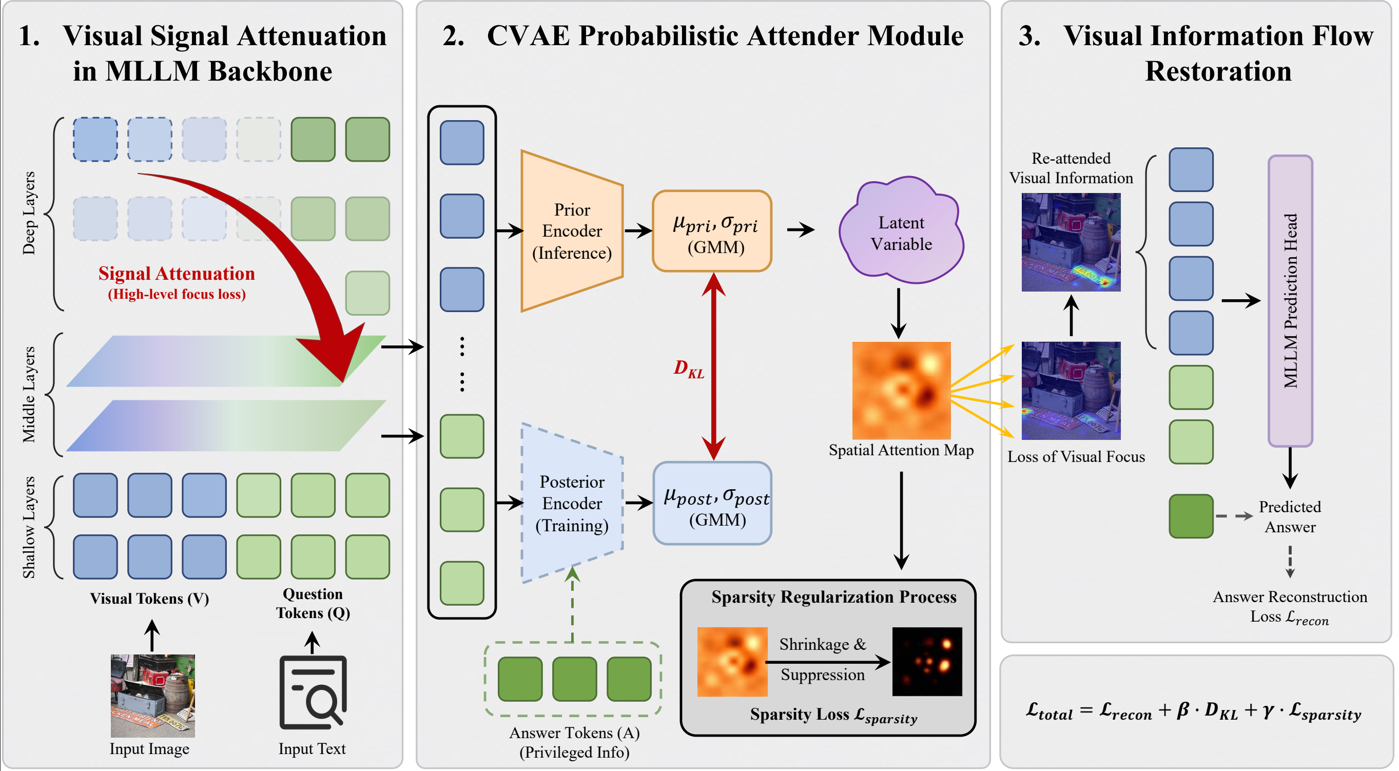 我们提出了一种面向多模态大模型细粒度视觉感知的变分信息流操控框架 VIF。我们从多模态大模型内部的信息传递过程出发,发现在现有 MLLM 的深层推理过程中,视觉信号会被文本 token 逐步压制和稀释,出现视觉衰减现象,从而难以持续关注小目标、局部细节和细微关系。为此,VIF 以概率建模的方式,将与问答任务相关的视觉显著性表示为潜变量分布,并通过基于 CVAE 的可插拔模块,在训练时借助答案信息学习任务相关的视觉关注,在推理时凭借图像和问题重建这种关注,并将其注入深层信息流中,从而把模型从“看不清、看不准”转变为对关键视觉区域的主动聚焦,在通用视觉理解、细粒度感知和视觉 grounding 等任务上都带来稳定提升。
