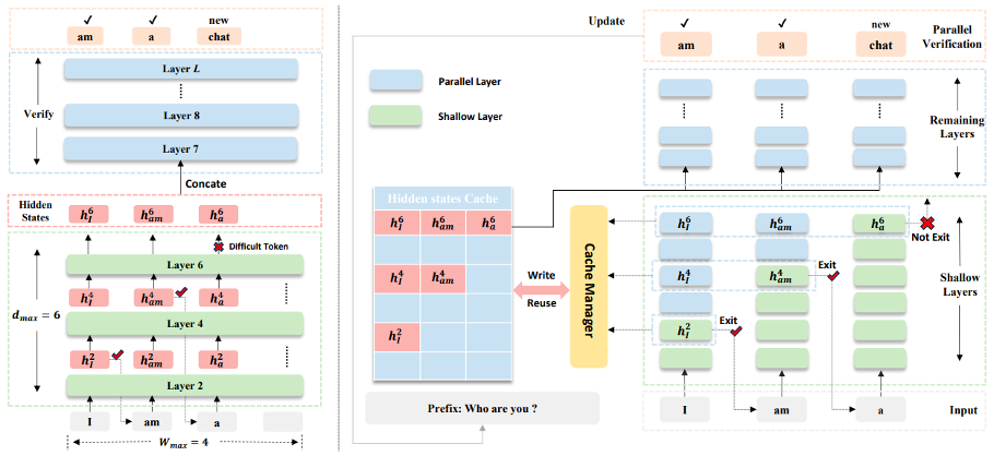 投机解码(Speculative Decoding)已成为加速大语言模型(LLM)自回归推理的一种极具前景的方法,尤其适用于逻辑推理与智能体协同等长文本生成场景。自推测(Self-draft)方法直接利用基座模型自身进行token预测,虽免去了维护独立辅助模型的开销,但仍面临两大关键瓶颈:其一,浅层网络常产生置信度虚高但结果错误的token预测;其二,草稿序列中一旦出现难以预测的token,便会迫使整个序列进入深层网络进行冗余计算,从而严重削弱候选词接受率与整体加速效果。针对上述问题,我们提出了一种全新的自推测框架。该方法引入基于层深的平滑策略动态校准提前退出(early-exit)置信度,并依据每一token的解码难度自适应地限制推测长度。当达到推测边界时,框架会将候选词隐状态在深层网络中进行统一的并行验证。该机制在最大化计算效率的同时,确保了输出结果与原始模型严格等价。该方法全程无需修改基座LLM的任何参数,在多种模型架构与多样化的长文本生成任务上,相比标准自回归解码最高可实现 2.33× 的端到端加速。